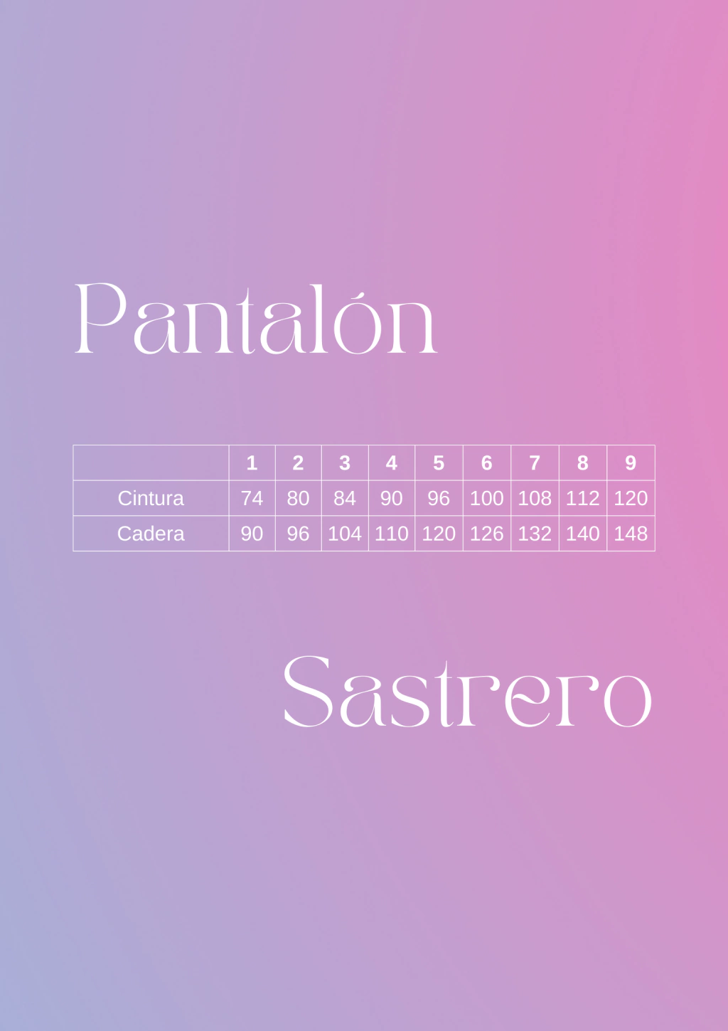 | Talle | Caderacm | Largo de piernacm | Cinturacm |